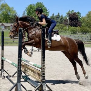 In the fall of 2021, Penelope participated in a Scott McKay clinic, where Scott spotted Penelope’s “immense natural talent” and recommended that she continue her education by riding new breeds of horses. Penelope began riding Mario, a thoroughbred, in 2022. She and Mario showed together at Trillium shows in the 2’3”-2’6” Hunter Ring that spring. Unfortunately, their time together ended early due to lameness.